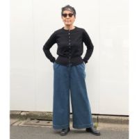 ■身頃: 10オンスのデニム素材を使用しました。 ウエスト総ゴム仕様で、楽なはき心地を実現。 ハイウエストでゆったりとリラックス感を作りながら、脚長効果も期待できます。