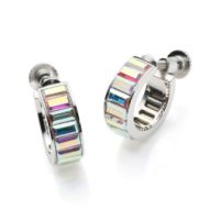 見る角度によって多彩な色味に変化する、オーロラボレーロカラーのスワロフスキー社製クリスタルガラスをあしらったフープイヤリング/ピアスです。