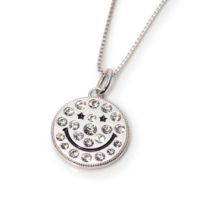 目と口をブラックがかったネイビーカラーのエナメルで描き、ビジュウをあしらったスマイルモティーフのロングペンダントです。