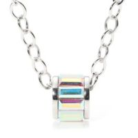 見る角度によって多彩な色味に変化する、オーロラボレーロカラーのスワロフスキー社製クリスタルガラスをセットしたリングモティーフのロングペンダントです。
