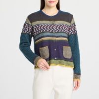 素朴な表情のウールと、メランジカラーのスラブヤーンをメインに使用。ミドルゲージで編み立て、表面に素材や編み柄による凹凸感があるのが特徴です。