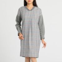 3種類の久留米かすりを使用したワンピースです。前後身頃や袖を横で切り替えたデザイン。表情に変化がつくように、柄の並びをずらして配したパッチポケットがポイントです。