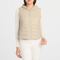 ■身頃: 高級なストレッチ素材を使用。 ファスナーで取り外し可能なフードをあしらいました。通常、フードは襟の外側に配してあるものが一般的ですが、襟の内側にあしらうことで、カジュアル感を抑えました。
