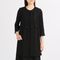 ■身頃: やや肉厚の二重織のサテン生地を表地に使用。上品な光沢感があり、さらっとした肌触りが魅力です。品のある深いブラックを追求するため、生地に濃染加工をほどこしました。 襟のサイズ感にこだわり、前立てをやや前下がりにデザインすることで、ボタンを留めても外しても美しく見えます。 ボタンは、派手になりすぎない上品なものを採用。 コーディネイトしやすい、絶妙な着丈に設定しまし…