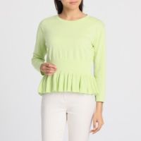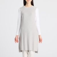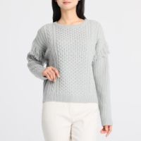 ■身頃: ベースは、立体感のある片畦編みで仕上げました。 ラウンドネックを採用し、フェミニンで柔らかな印象に。