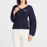 ■身頃: 羊毛とタヌキの毛をミックスした、肌触りの良い軽やかなニット素材を使用。 浅めに設定したVネックが、大人の女性らしい印象を醸し出します。