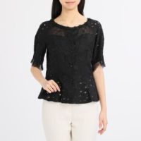 ■身頃: 綿混素材の大柄のラッセルレースをベースに使用。エレガントな雰囲気を醸し出しつつ、程良くカジュアルな表情に仕上げました。 ネックラインの立体感のあるフラワーモティーフが、お顔周りを華やかに演出。 胸ヨーク部分には、繊細なリバー調ラッセルレースと、チュールを重ねており、程良く透け感を楽しめます。 袖口にもレース生地をあしらい、二の腕をカバーしつつ、華やかさをプラス。…