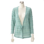 幾何柄をボーダー状に配した、柔らかな風合いのレースを使ったカーディガンです。袖はスッキリとした九分丈で、フリル風の2枚衿が可愛らしさを演出。