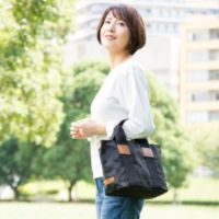 光沢感のあるナイロンのツイル生地や、持ち手周りの合皮、底鋲が素敵な雰囲気のトートバッグ。取り外し可能なショルダーテープ付きの2WAY使用です。