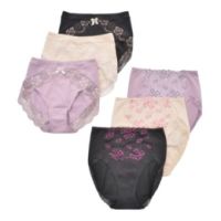 花柄のストレッチレースがエレガントな2柄を3色ずつセットにした、ショーツ6枚組をご紹介します。フロント部分にはポリウレタン混で伸縮性がある、2浴染めの日本製レースを使用。
