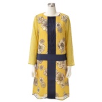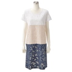 「AURICULA」から、ファンシー織物と無地のカットソー素材を組合せたシャツワンピースです。前身頃にはファンシー織物を使用。
