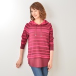重ね着風の着こなしが1枚で楽しめる、フード付きのトップス。表面感のある見ためですが、実はプリントによってあしらわれています。