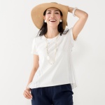 「ANELALUX」より、前身頃を華やかなレースで切替えた、細見えトップスをご紹介します。身頃にはボディラインをひろいにくい、程よい肉感とストレッチ性のある素材を使用。
