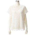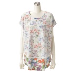 身頃部分にラッセルレースを重ねた、女性らしいチュニック。前面はレースの奥に花柄プリントが透けてフェミニン、背中側は花柄プリントがしっかり見えて、明るい印象になります。
