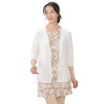 爽やかな透け感のあるレース素材のプルオーバーと、ゆったりシルエットで体型をカバーするパンツのセットです。