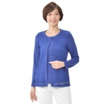 前開きの丸首カーディガンとプルオーバーを組合せた、ニットアンサンブルです。プルオーバーの前身頃を、サテンのスカーフ柄プリントで切り替えた高級感のあるデザイン。