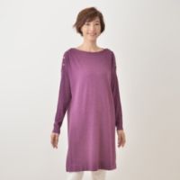 綺麗なストレートシルエットのニットワンピースです。肩部分の開閉できるボタンがアクセント。ビッグシルエットで楽な着心地ながら、袖をリブ編みにすることですっきり着ていただけます。