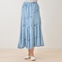 草花モチーフをプリントで表現した、ライトオンスのデニムスカートです。表地はストンとした落ち感でシルエットを美しく見せる、軽やかなタッチのライトオンスデニム素材を使用。