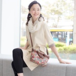 華やかなシフォンプリントが魅力的なブラウス。裏側にはポリウレタン混の天竺素材を使用し、着心地も楽ちんです。フロントにはタックを入れて分量感を出し、体型をさりげなくカバー。バストにはダーツを入れて、綺麗なシルエットを演出します。袖はフレアスリーブで可愛らしく。ふんわりと揺れる、無地のシフォンフリルの裾もフェミニンです。