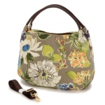大きな柄がパッと目を引く、セミショルダーバッグです。本体にはスペイン製の生地を使用。持ち手くるみ生地やアイレット台生地、マグホック台生地、ファスナー引手、ファスナーあて生地には、牛革を使っています。