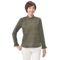 ポリエステルレーヨン混の肌触りのよい素材で、着回しのきくプルオーバーを作りました。フロントには幅広のレースをあしらって、華やかさをプラス。