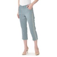 両サイドに豪華な刺繍を施した、可愛らしいデニムパンツです。ウエストは総ゴム仕様のプルオンタイプ。程よくストレッチの効いた素材で、快適にお召しいただけます。