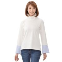 袖口のデザインがお洒落なハイネックプルオーバーです。身頃部分は着心地の楽なカットソー仕立て。袖口をストライプの布帛で切り替えたベルスリーブが、華やかなアクセントになっています。