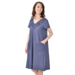 シンプルで上品なサマーニットワンピースです。前身頃にあしらった2つのポケットがアクセント。プレーティング(添え糸模様)で濃色と淡色をうまく切り替え、すっきりとしたシルエットに仕上げました。