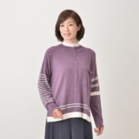 部分的に配したボーダー柄が印象的なニット素材のカーディガンです。裾や腕などに幅や編み方を変えたラインを入れて、軽快な雰囲気に仕上げました。