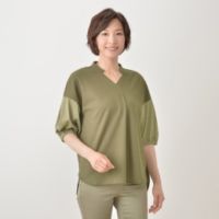 異素材使いで表情ゆたかに仕上げたプルオーバーです。袖と後ろ中心を異素材で切り替え、女性らしいニュアンスをプラス。
