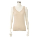 綿65%とシルク35%の天然素材100%で仕立てた、タンクトップをご紹介します。デザイン性のある可愛い編地と、レースが目を引くデザイン。