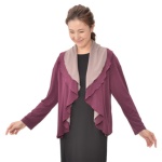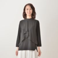 ジャージー素材をベースにした、エレガントなカーディガンです。衿元からフロントにかけてのドレープ部分は、異素材との2枚仕立てで華やかなデザインに。