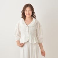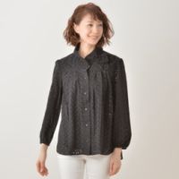 繊細なカットワークレース素材で仕立てた、華やかさ満開のエレガントブラウス。首元からふわりと浮いたボリューム感ある衿のフォルムや、花をイメージしてクチュールされた飾りで、とってもフェミニンな印象です。