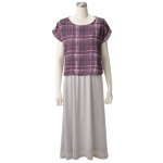 着心地の良いジャージー素材にシフォンを組合せた、エレガントなワンピースです。前身頃には、タックプリーツを施したシフォンをアシンメトリーに配置。