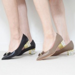 デイリー使いしやすい素材で仕立てたパンプスです。踵のキラキラ光るビジューチャンキーが、後姿まで美しく見せるデザイン。