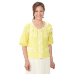 シフォンドットプリントとラッセルレースを組合せた、フェミニンなジャケットです。前立てにはリボンをあしらって、可愛らしさをプラス。