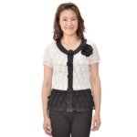 フロントにレースを重ねて立体感と豪華さを表現した、エレガントなブラウスです。身生地には、シワになりにくい強燃のジャージー素材を使用。