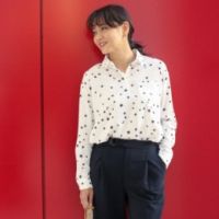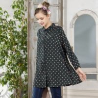 落ち感のあるポリエステルの生地を使用した、ドットプリント素材のシャツチュニック。裾に向けてたっぷり分量をとった、ふんわりとしたフレアーシルエットが素敵です。