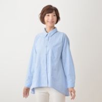 布帛とカットソーを組合せた、異素材使いのシャツです。前身頃と袖には布帛を、後ろ身頃には綿混のカットソーを使用。