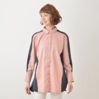 切り替えのデザインで細見えするシャツです。フロント、カフス、襟部分には布帛素材を使い、バック部分にはカットソーを使用しました。