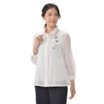 フロントにレースを重ねて立体感と豪華さを表現した、エレガントなブラウスです。身生地には、シワになりにくい強燃のジャージー素材を使用。