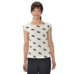 ホース柄のプリント生地を使用した、シンプルなプルオーバー。動きやすく、楽なフレンチスリーブなので、上着を羽織っても邪魔になりにくいです。