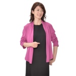 ドレープ使いがエレガントな、オープンフロントのカーディガンをご紹介。生地には、シルケット加工、バイオ加工、ガスやきを施したものを使用しました。