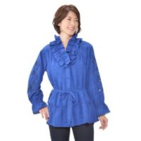 立体感のあるラッフル衿が、華やかさをもたらすチュニックブラウスです。袖には光沢感のある糸で、繊細かつ大胆な刺繍柄を施し、上品な華やかさを表現。