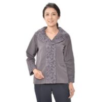 控えめな光沢感のある布帛生地で仕立てたジャケットです。刺繍レース生地と、立体感のある大きめな衿で、大人のドレスカジュアルスタイルを表現。