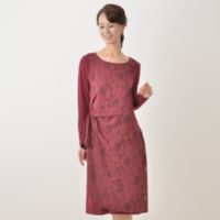 ジャージー素材をベースに、ソフトなジャカードを前身頃に組合せたワンピースです。片側サイドにあしらったラフなリボンとドレープ感が、立体感とゆとりを演出。