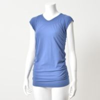 脇にシャーリング加工を施した、ドレープが前後に美しく流れるTシャツです。ソフトな伸縮素材のマイクロファイバーを使っているので、体の動きにフィット。身頃は360度縫い目が無い、成型編みで仕上げました。横に流れるシャーリング効果により、気になる体型を自然にカバー。また、フレンチ袖が二の腕をほっそり見せてくれます。そのまま1枚でも、またジャケットなどのインナーにもぴったりです。
