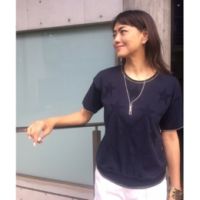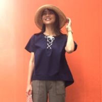 前中心にあしらったレースアップの編み上げ紐がお洒落な、マリン調のプルオーバーです。身生地は綿のタイプライター素材を使用。