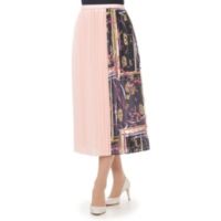 サイドの一部分をスカーフ柄のプリント生地で切り替えた、お洒落なロングプリーツスカートです。身生地には合繊のデシンを使用。