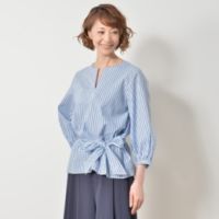 涼しげなストライプ柄の生地で仕立てた、キーネックデザインのブラウスです。身生地はナチュラルな風合いの、綿100%のローン生地を使用。